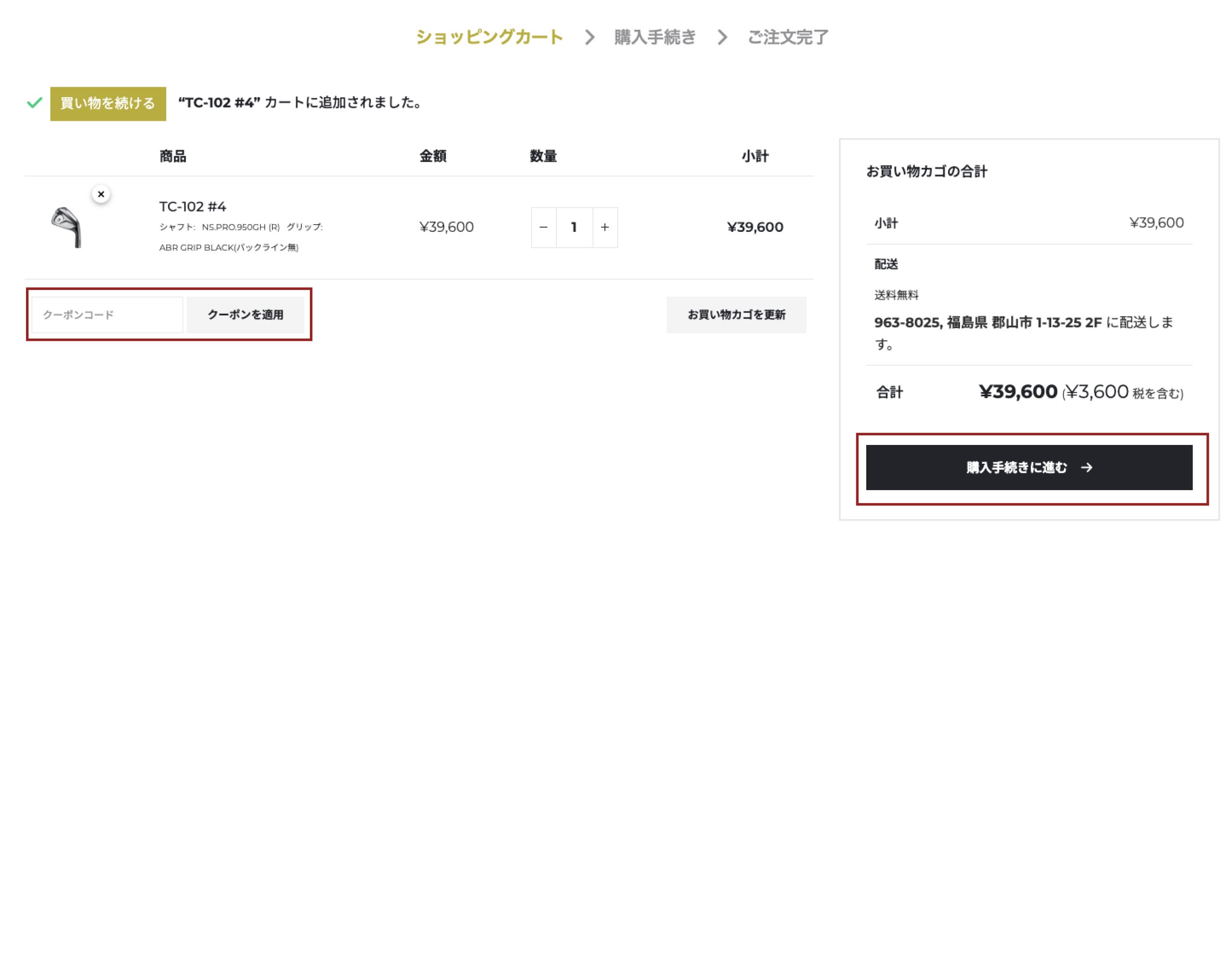 クーポンコードをお持ちの場合は、クーポンコードをご入力後、必ず「クーポンを適用」ボタンを押して適用してください。
