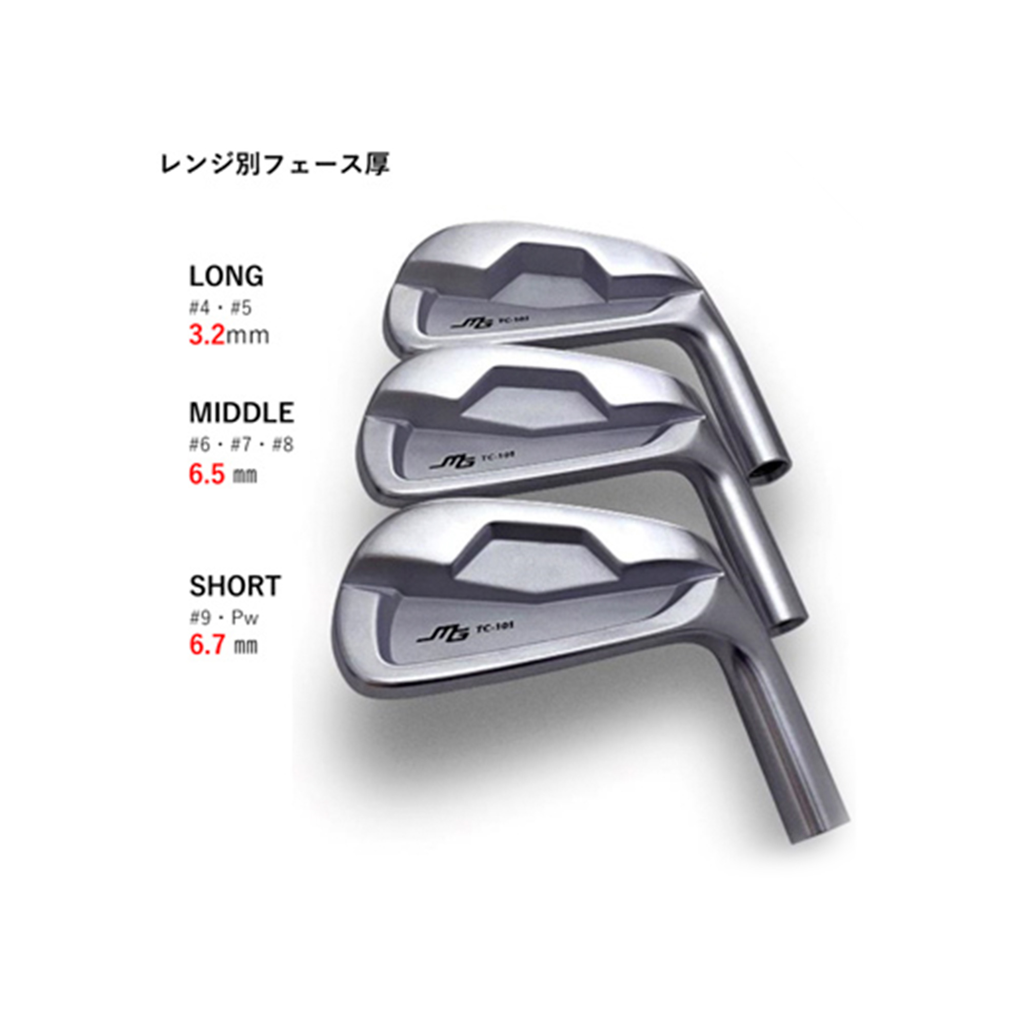 ロング・ミドル・ショートレンジ毎に、トゥ・ヒールへの重量配分及び重心高、インパクトポイントのフェース肉厚を設定。